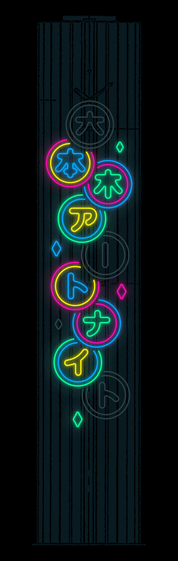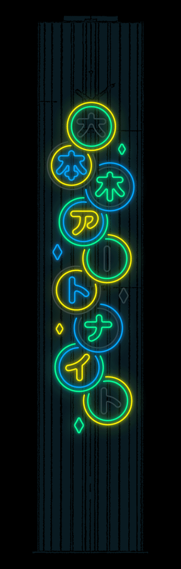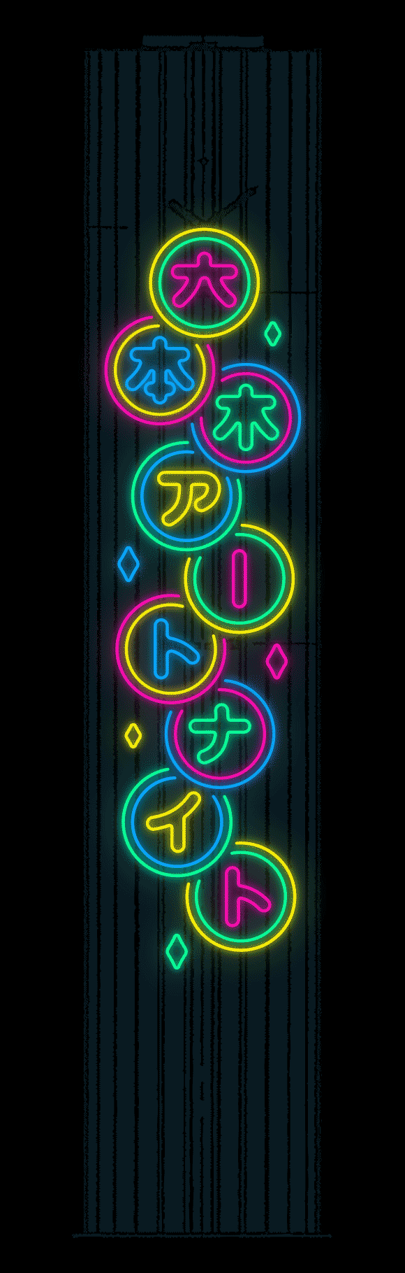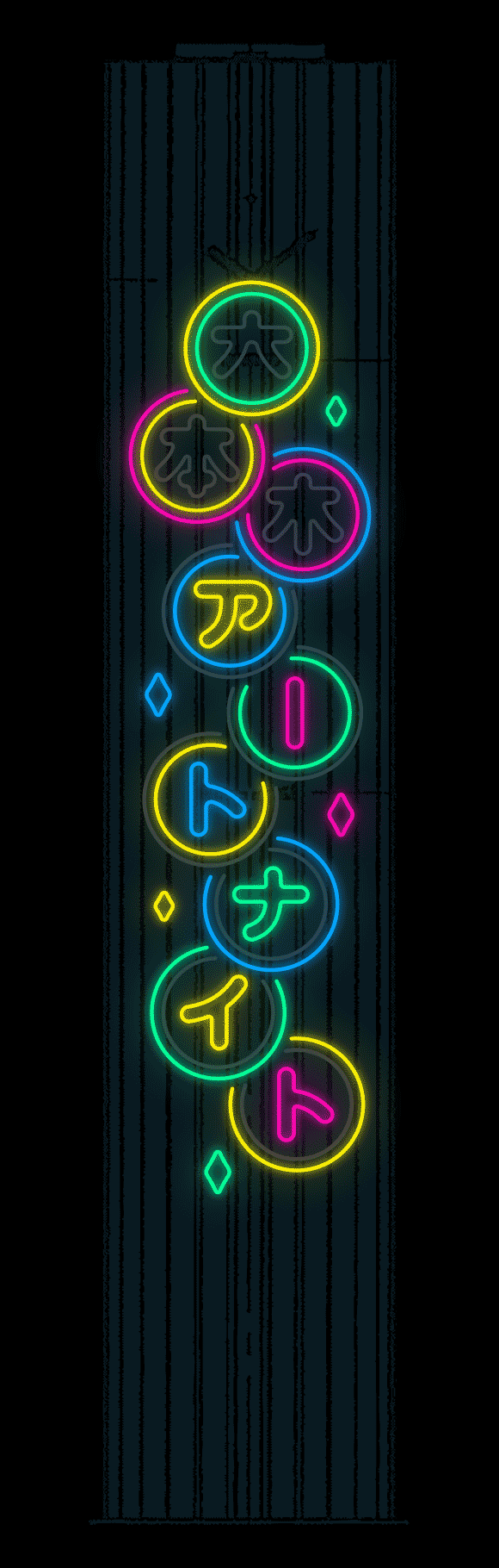 イベントの開催を伝えるLEDのネオンサインです。祝祭感をまとった派手なインフォメーションは、目的地への誘導であり、祭りへの入口であり、芸術への招待であり、そのときここに到着した記録でもあります。うたかたの夜に力強く立ち上がった発光体のもと、人々が集まり、明滅のループの中で永遠と刹那を感じます。今ここは、六本木アートナイトです。